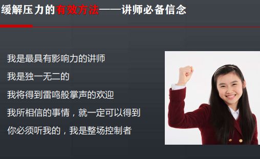 遇上人为的压力,学会对自己进行积极的暗示——对自己充满信心地讲课和发挥有帮助;
