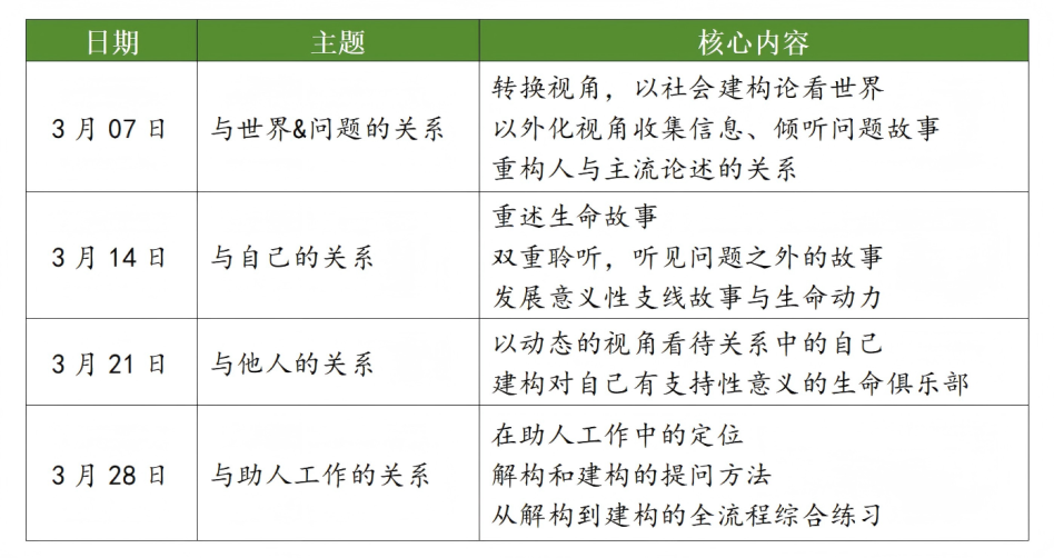 2026年初,春风将携手合适咨询(深圳)有限公司推出最贴近助人者工作与生活场景的叙事疗法系列课程,此课程致力于心理学方法的生活化,不仅对助人工作有帮助,更适用于自己的生活。