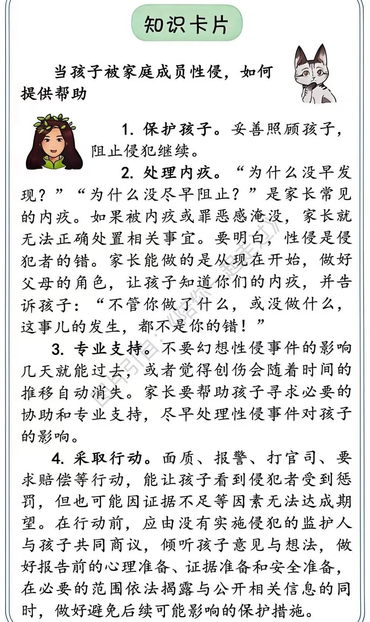 完善的社会支持体系是预防和应对家庭性侵的重要保障。社区定期开展的普法宣传、心理健康讲座,家长可带着孩子积极参与,自觉提升防范意识与应对能力;学校要建立健全校园保护机制,教师发现学生存在情绪低落、身体创伤、回避特定亲属等异常表现时,需及时介入了解情况,必要时联动家长、公安或妇联机构,形成联动处置合力。